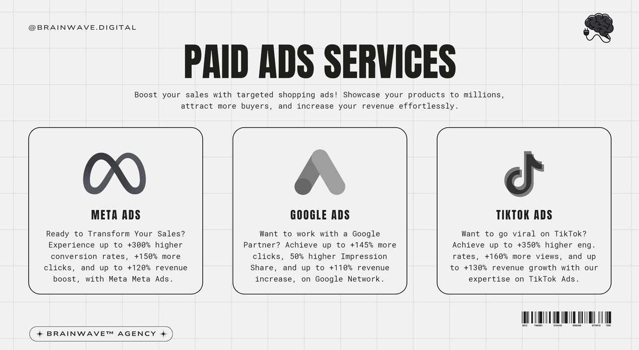 At BrainWave™, we create data-driven campaigns for platforms like Google, Meta, and TikTok Ads. With over €15M in ad spend, we deliver measurable results and growth.