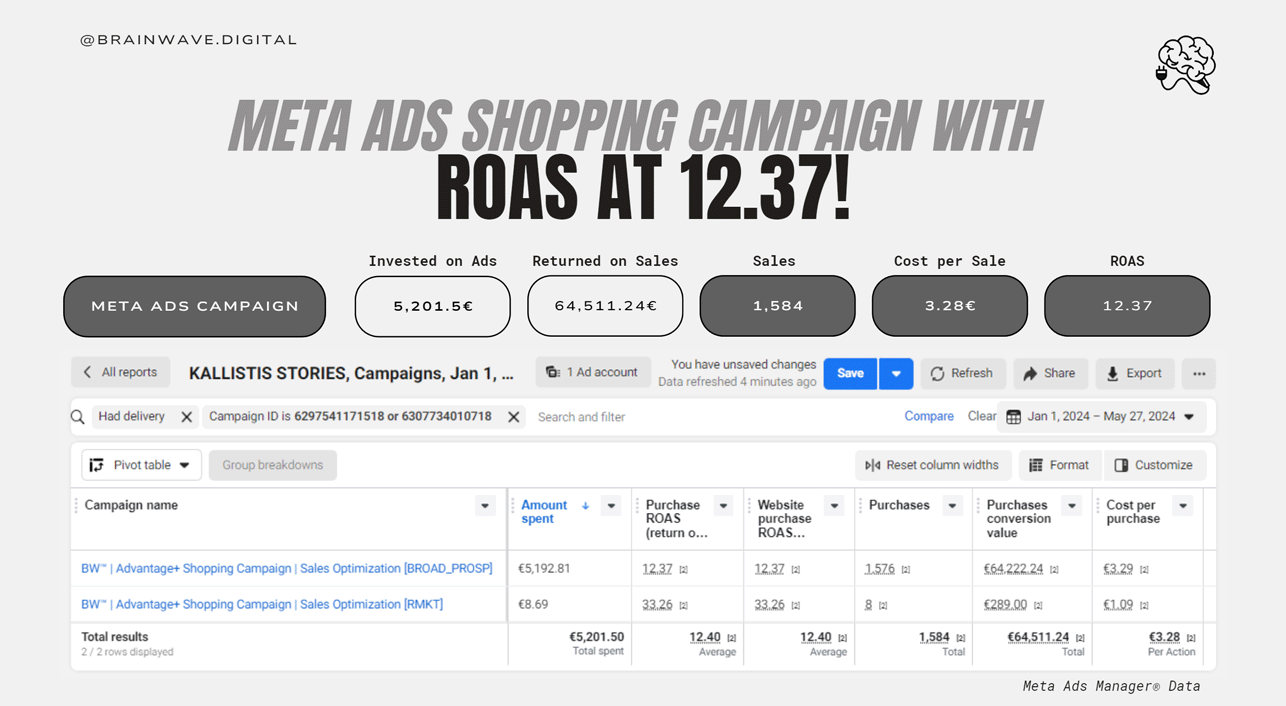 With proven success in achieving exceptional ROAS of 12,37 in our clients, we specialize in creating Meta Ads campaigns that deliver outstanding performance and profitability, in both E-commerce and Lead Generation Projects.